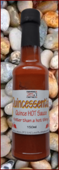 Ingredients - quince, onions, sugar, cider vinegar, ginger, garlic, sunflower oil, lemon juice, lime juice, scotch bonnet chillies, carolina reaper mash, lemongrass, salt.